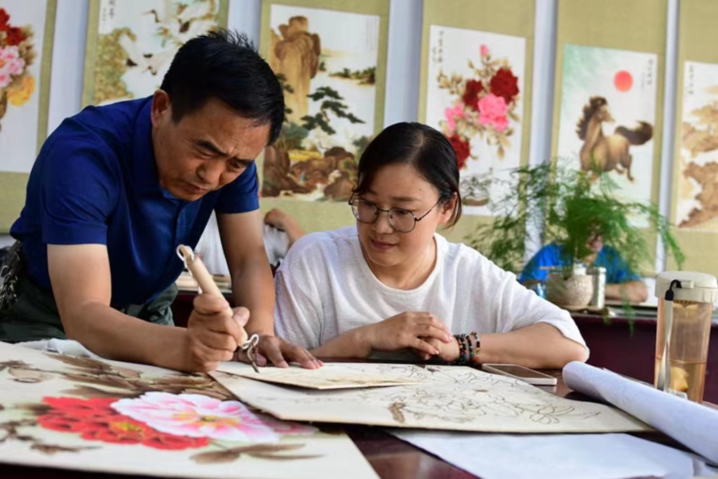 烙畫(huà)師(shī)傅介紹烙畫(huà)作(zuò)品。陳輝 攝