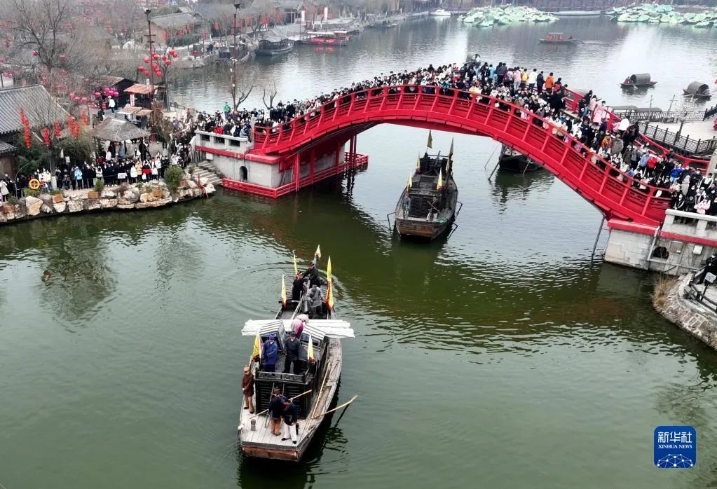 2月(yuè)18日(rì),遊客在開(kāi)封清明(míng)上(shàng)河(hé)園景區(qū)觀看(kànδ)民(mín)俗表演(無人(rén)機(jī)照(zhào)片)。