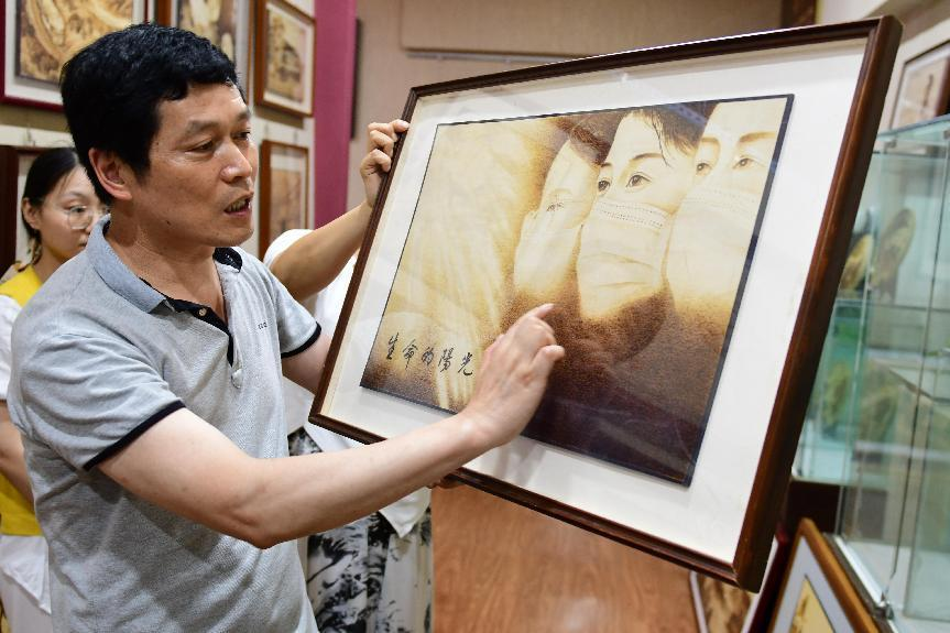 烙畫(huà)師(shī)傅介紹烙畫(huà)作(zuò)品。陳輝 攝