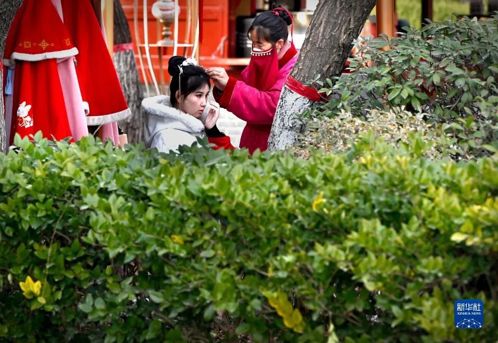 遊客在開(kāi)封清明(míng)上(shàng)河(hé)園景區(qū)內(nèi)穿傳統服飾(2月(yuè)€14日(rì)攝)。