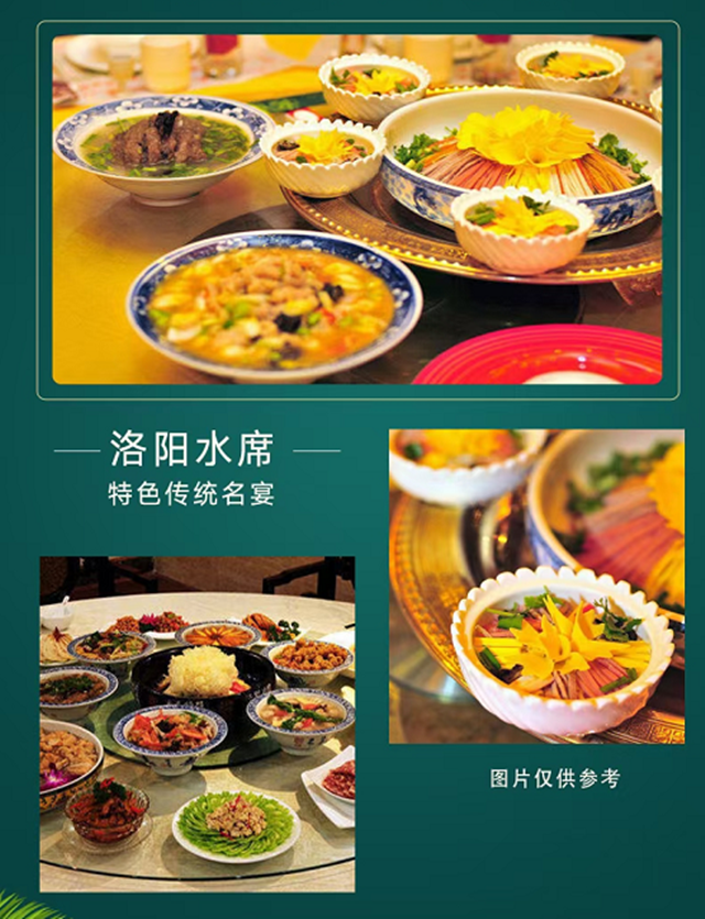 享用(yòng)洛陽特色餐【水(shuǐ)席】,洛陽水(shuǐ)席已有(yǒu)1000多(duō)年(nián)的(de)曆史,各種熱(rè)菜湯湯水(shuǐ)水(shuǐ)一(yī)道(dà≈o)一(yī)道(dào)緩緩而上(shàng)如(rú)行(xíng)雲流水(shuǐ),和(hé)洛陽牡丹花(huā)會(huì)、龍門(mén)石窟并稱為(wèi)洛陽三絕。